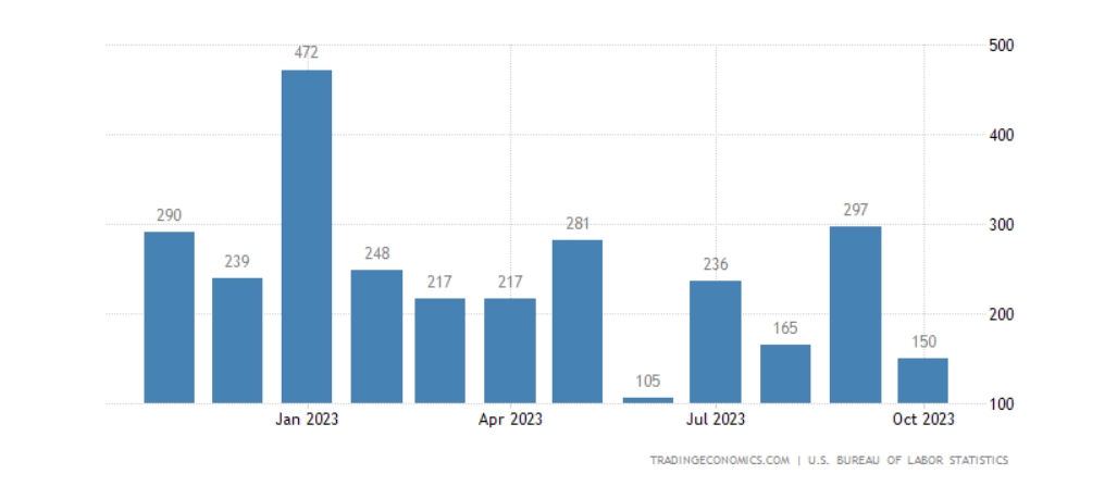具体来看,10月份非农就业总人数增加了15万人,低于预期值18万人,也远低于过去12个月平均每月25.8万人的增幅。